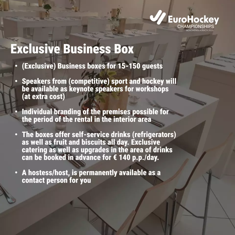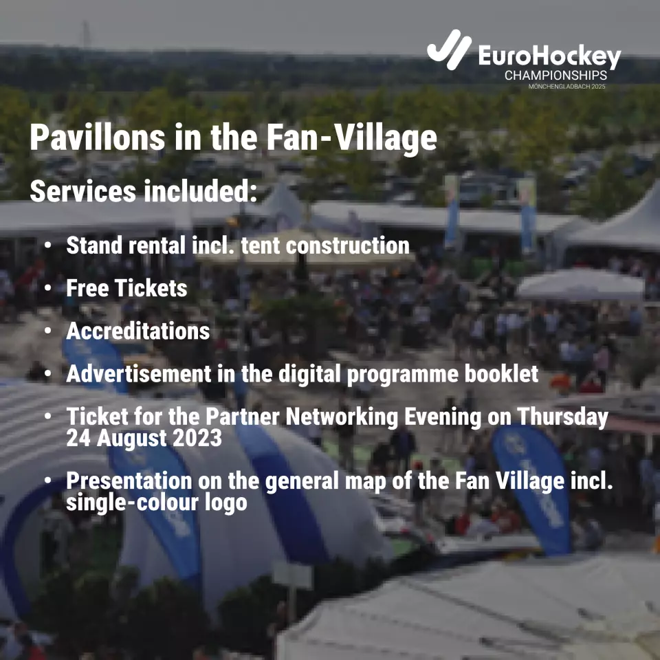 After the great success in 2023 the EuroHockey Championships are back in Germany! The EuroHockey Championships 2023 for men and women will be held from 18 - 27 August 2023 in the Hockeypark Mönchengladbach. In addition to the European championship title, the direct qualification for the hockey World Cup 2026 in the Netherlands and Belgium is also at stake. For you, the EuroHockey Championships 2025 will offer the excellent opportunity to be featured in the context of unique emotions. With a stand in our Fan Village, you will not only be able to present yourself during the event, you also have the opportunity to attract an exciting target group for your company. To ensure that the EuroHockey Championship is a complete success for you and the fans, we have put together business offers to help you with the individual planning of your company presentation.