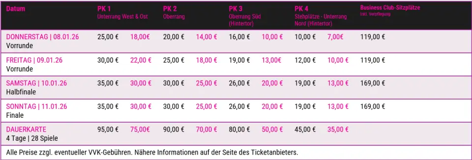We are offering school classes free admission to the first matches on Thursday, 8 January 2026 and Friday, 9 January 2026. This offer is valid for school classes of up to 30 pupils and 2 teachers. All participants must arrive together as a group. Unfortunately, latecomers cannot be accepted for logistical reasons. Please note: After the listed matches, the right to a seat expires and the seats will be reoccupied.