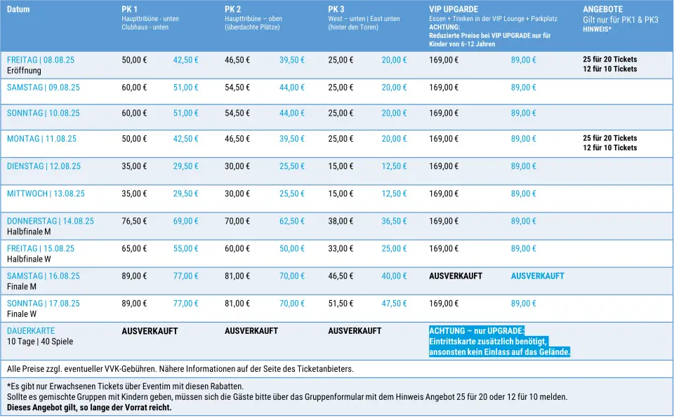 Fans können bei der Europameisterschaft jeweils Tagestickets erwerben und so täglich mehrere Spiele live verfolgen. Das günstigste Ticket ist in der Preisklasse 3 bereits ab 12,50 € zu erwerben. Für das ganz besondere Erlebnis haben wir auch ein VIP-Upgrade für Euch im Angebot. Die VIP-Upgrades enthalten Essen und eine Getränkeauswahl in unserer Lounge sowie kostenloses Parken. Für den Zugang und einen Sitzplatz im Stadion ist auch für Inhaber des VIP-Upgrades eine Eintrittskarte erforderlich.